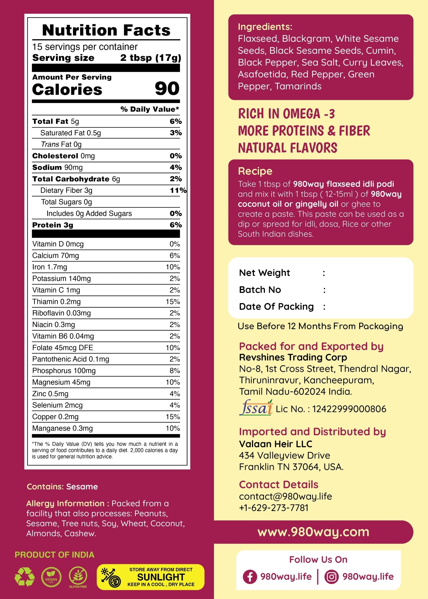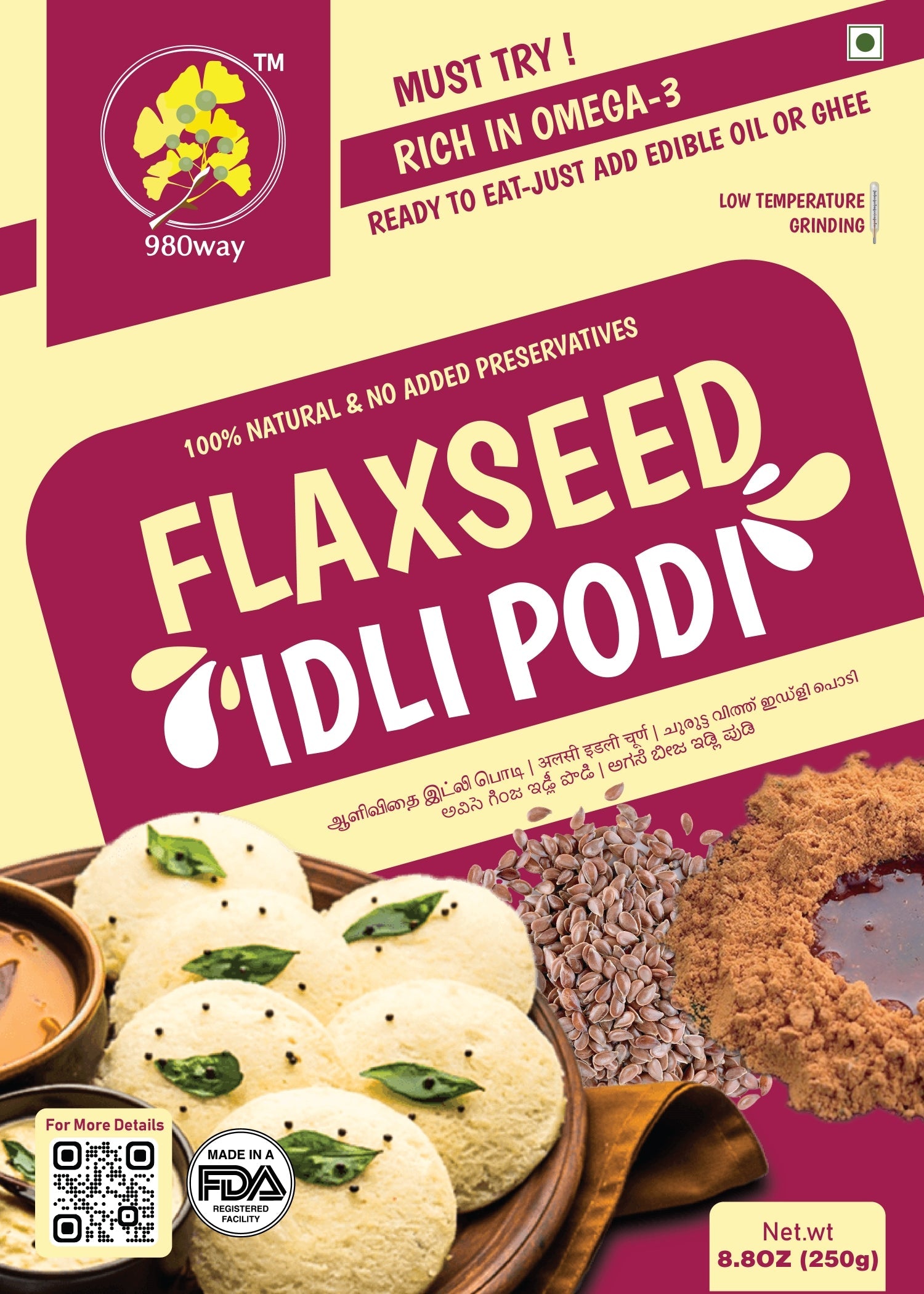 Flaxseed Idli Podi is a versatile and nutritious condiment crafted from a blend of flaxseeds, black gram, white sesame seeds, black sesame seeds, cumin, black pepper, sea salt, curry leaves, asafetida, red pepper, green pepper, and tamarinds. This unique fusion offers a myriad of health benefits, making it an indispensable addition to any culinary repertoire.