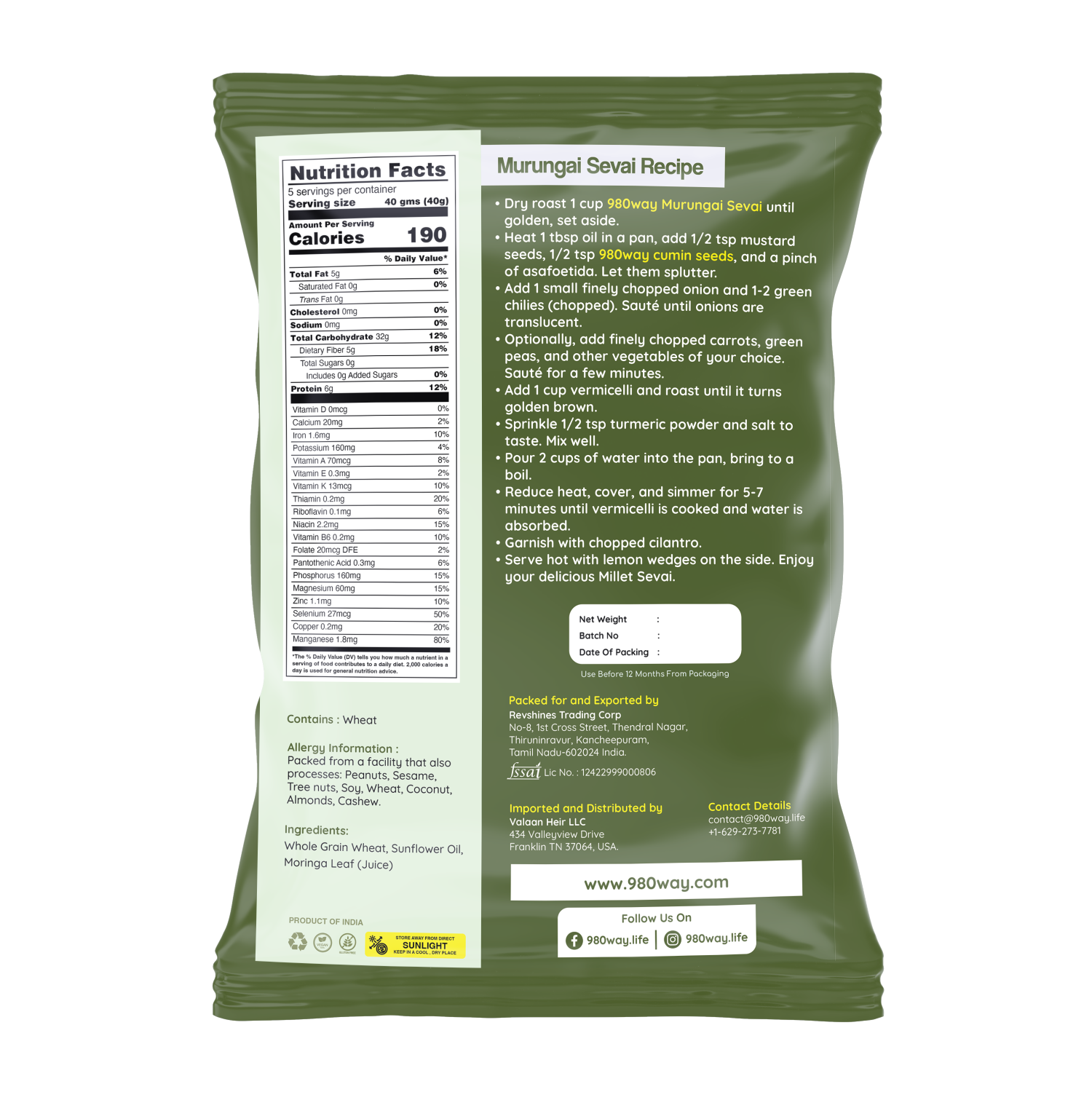Indulge in the goodness of Moringa Vermicelli (Murungai Sevai), crafted with wholesome Whole Grain Wheat, potent Moringa Leaf Juice, and nourishing Sunflower Oil. Bursting with essential nutrients, this vermicelli offers a delightful twist to your favorite pasta dishes while providing a rich source of antioxidants, vitamins, and minerals. Elevate your culinary experience with this healthy, flavorful alternative, perfect for conscious eaters seeking both taste and wellness in every bite.