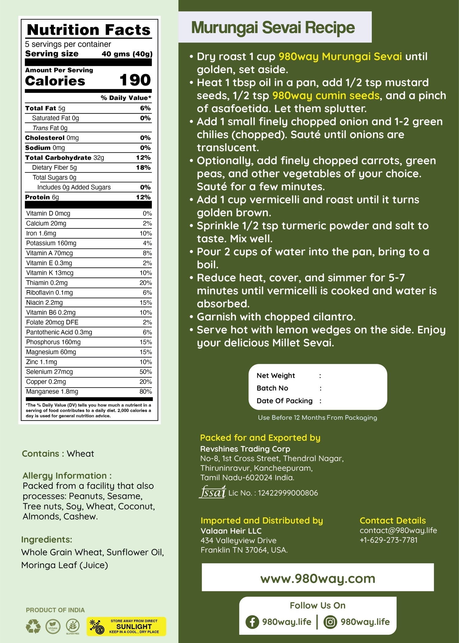 In international cuisine, Moringa Vermicelli (Murungai Sevai) can be used as a healthy alternative to traditional pasta. Boil the vermicelli until al dente, then toss with your favorite pasta sauce, such as marinara, pesto, or Alfredo. Add cooked vegetables like spinach, cherry tomatoes, and mushrooms for extra nutrition and flavor. Finish with a sprinkle of Parmesan cheese or nutritional yeast for a delicious and satisfying meal that's both nutritious and gourmet.