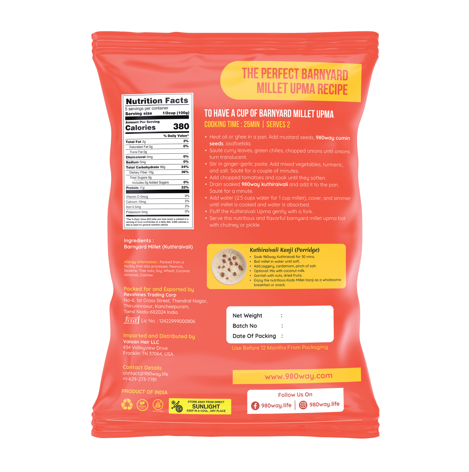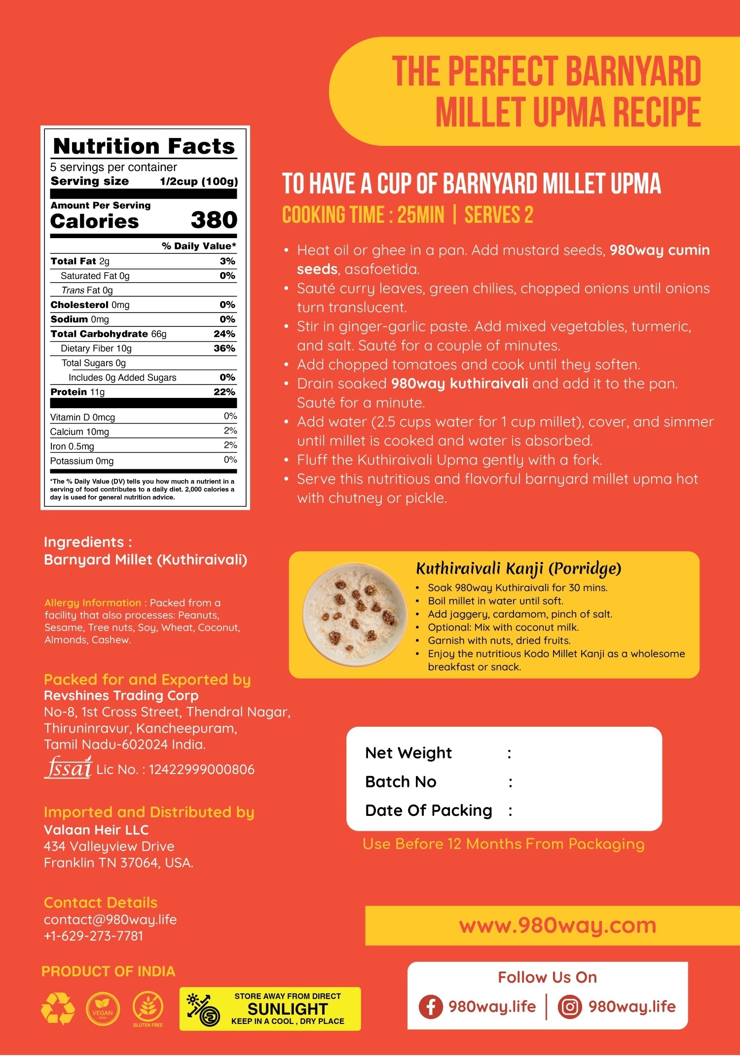 Incorporating Barnyard (Kuthiraivali) Millet into both Indian and International cuisines adds nutritional value and diversity to meals, making it a versatile and beneficial ingredient for health-conscious consumers.
