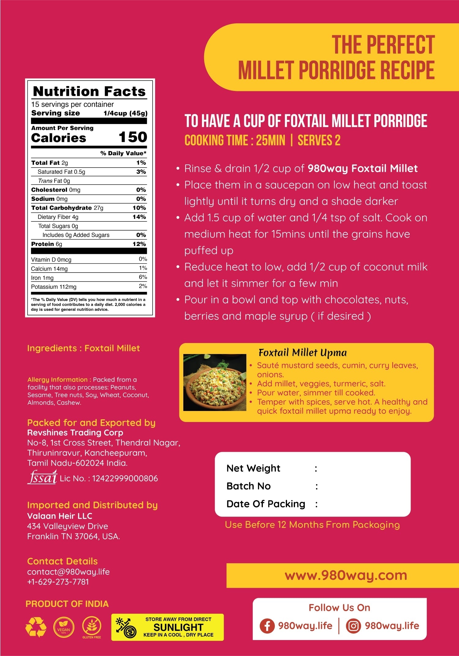 Incorporate Whole Foxtail Millet into your culinary repertoire to enjoy its delightful taste and numerous health benefits, both in traditional Indian dishes and innovative international creations. Elevate your meals with this versatile and nutritious ancient grain!