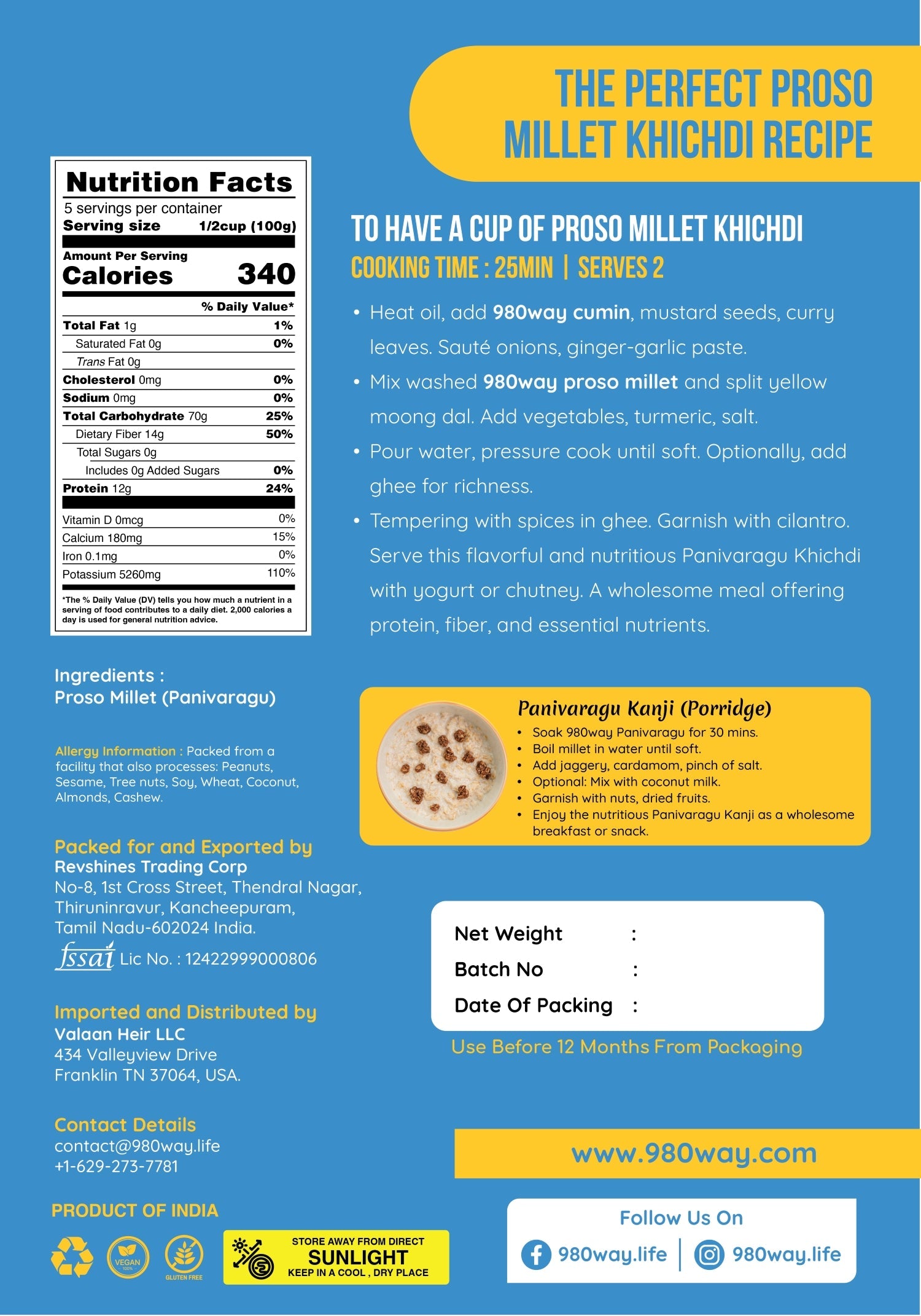 Proso Millet, also known as Panivaragu, is a highly nutritious gluten-free grain rich in fiber, protein, and essential minerals. Incorporating Proso Millet into your diet can offer numerous health benefits, including improved digestion, enhanced heart health, and better weight management. Its low glycemic index makes it an ideal choice for regulating blood sugar levels. Additionally, Proso Millet is packed with antioxidants, promoting overall well-being and immune function.