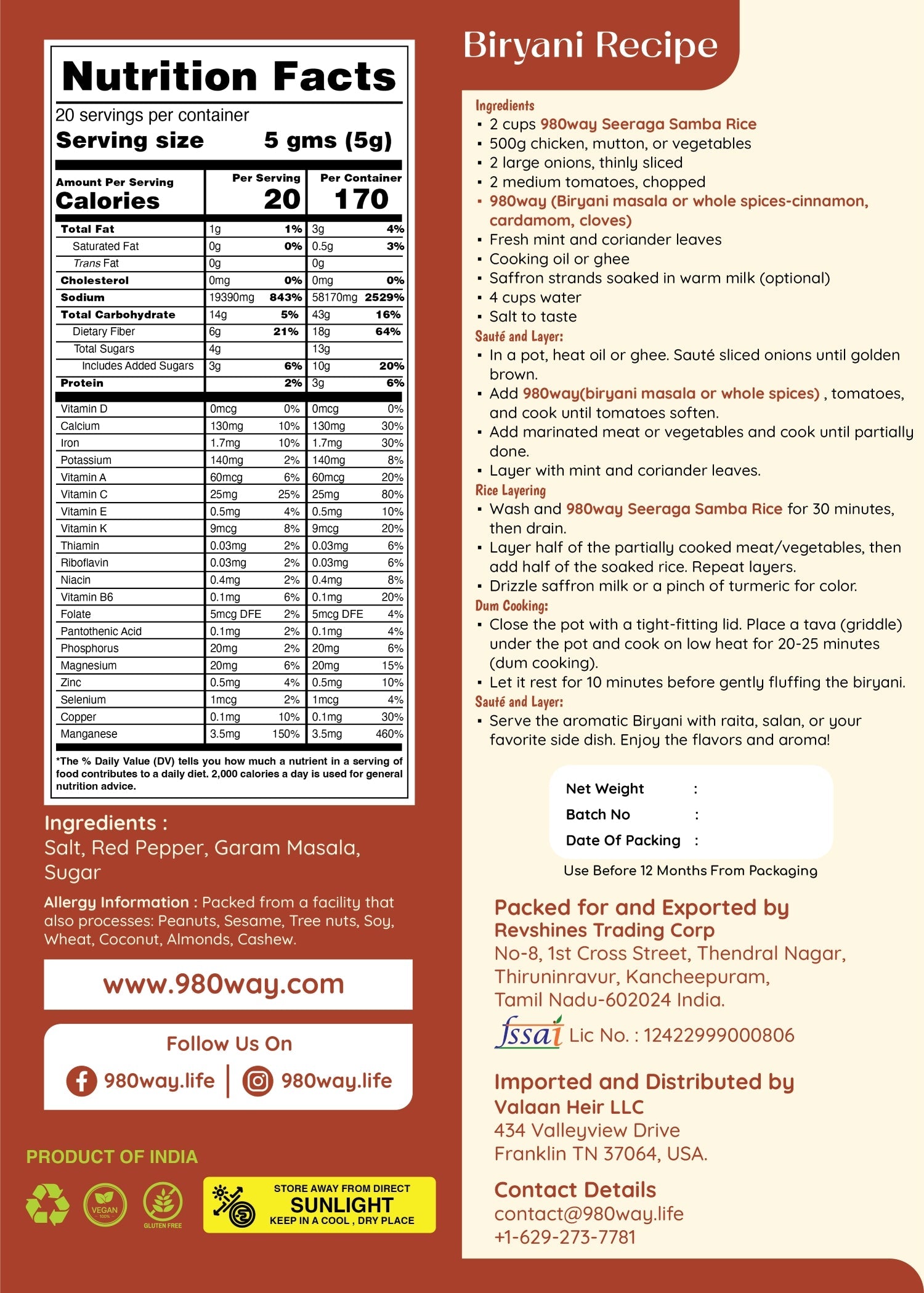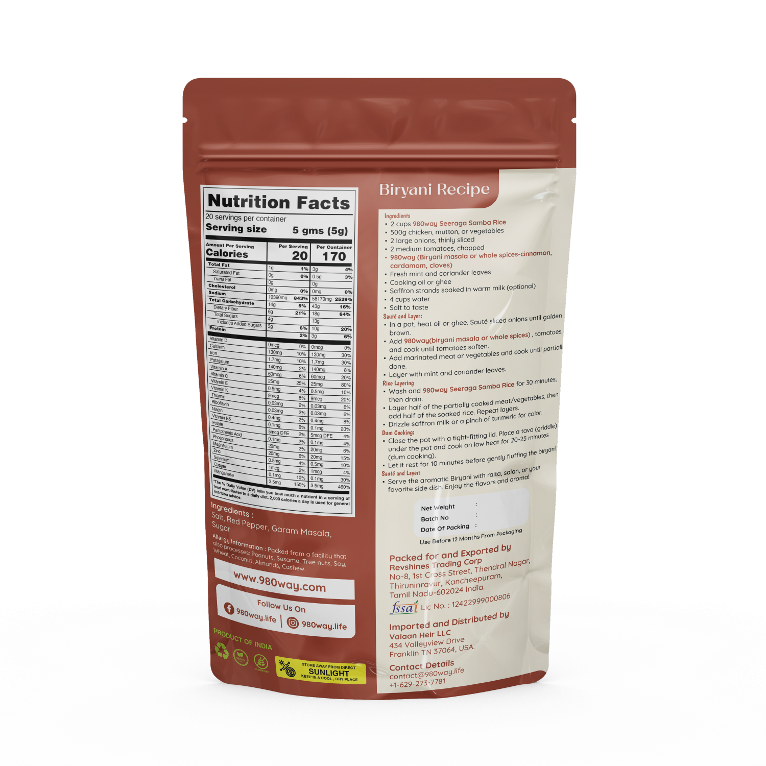 Elevate your culinary experience with our premium Biryani Masala Powder, meticulously crafted to deliver exceptional quality and flavor. Our blend of aromatic spices brings an authentic taste to every dish, whether you're preparing traditional Indian biryanis or exploring international cuisines. Enjoy the versatility of our spice mix, enhancing the taste of meat, vegetables, or grains with ease. Experience the convenience of creating delicious meals in no time, all while appreciating the rich authenticity and heritage of our time-honored recipe. Additionally, our spice mix offers health benefits, adding both flavor and nutrition to your dishes.