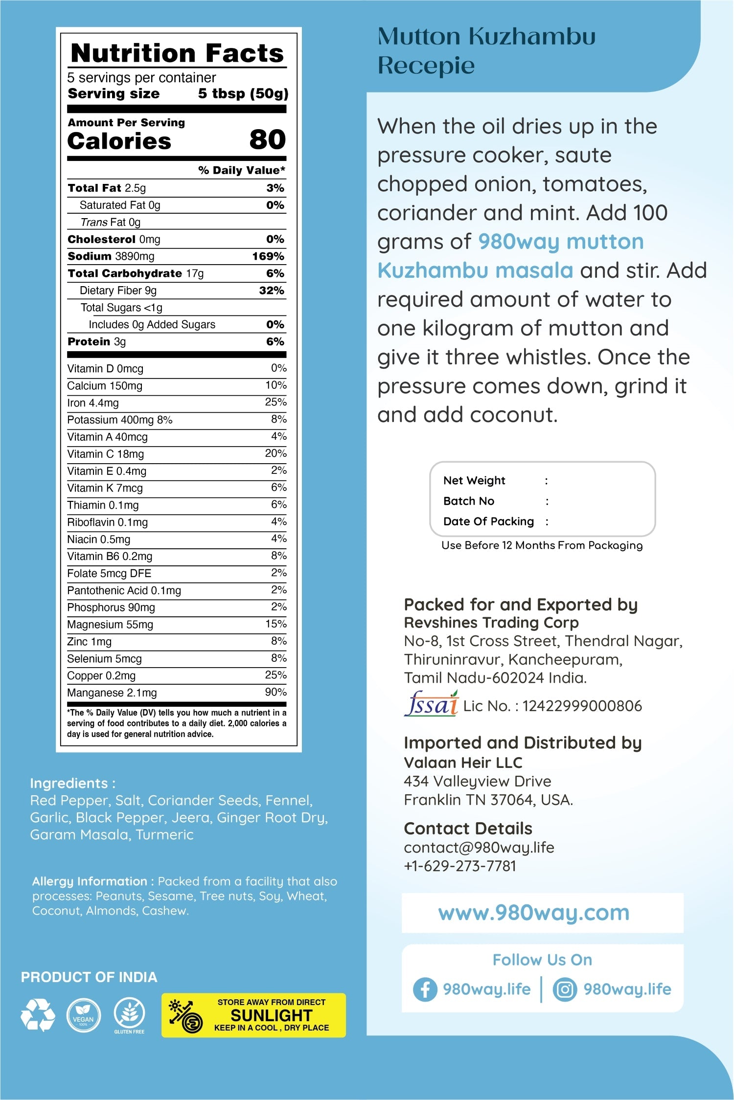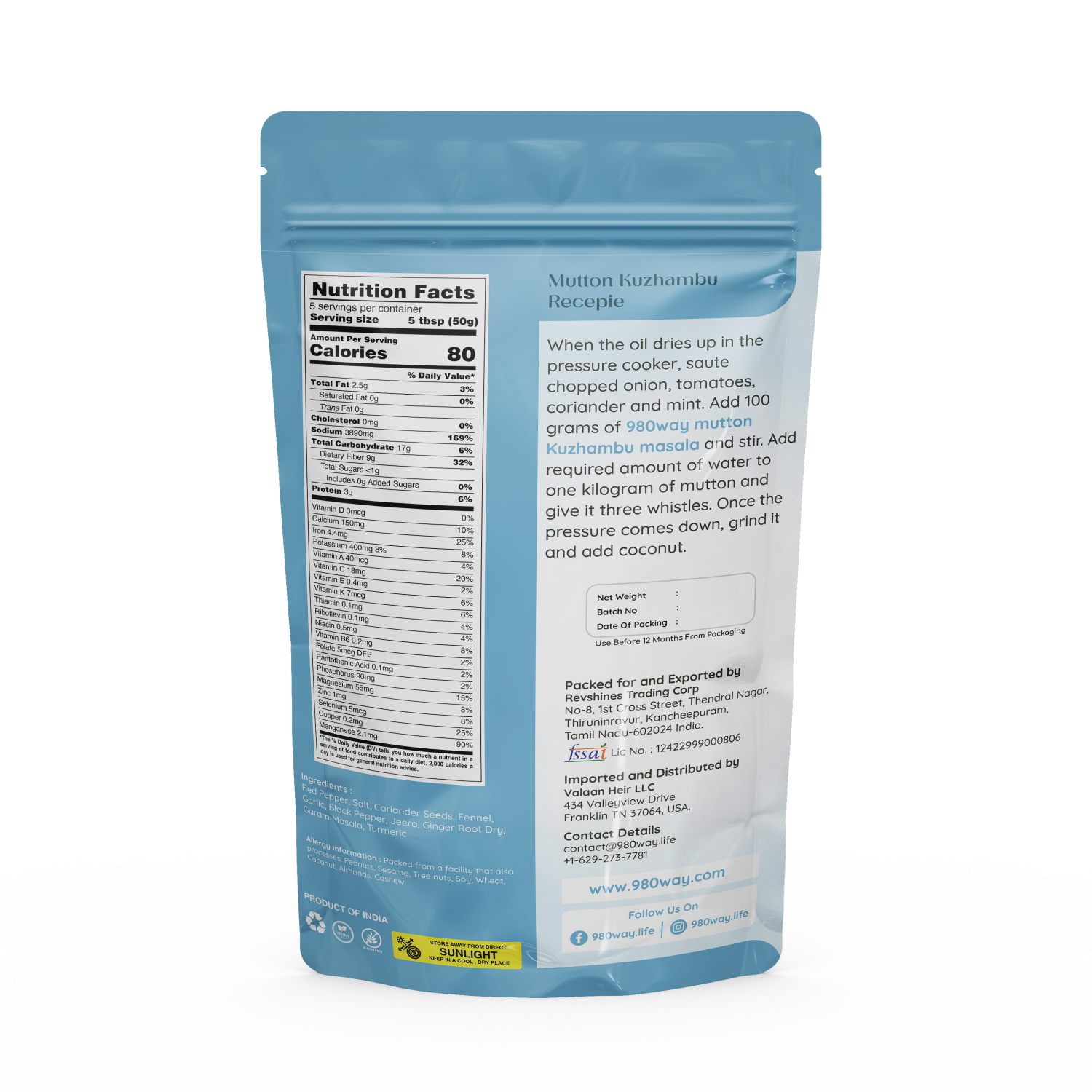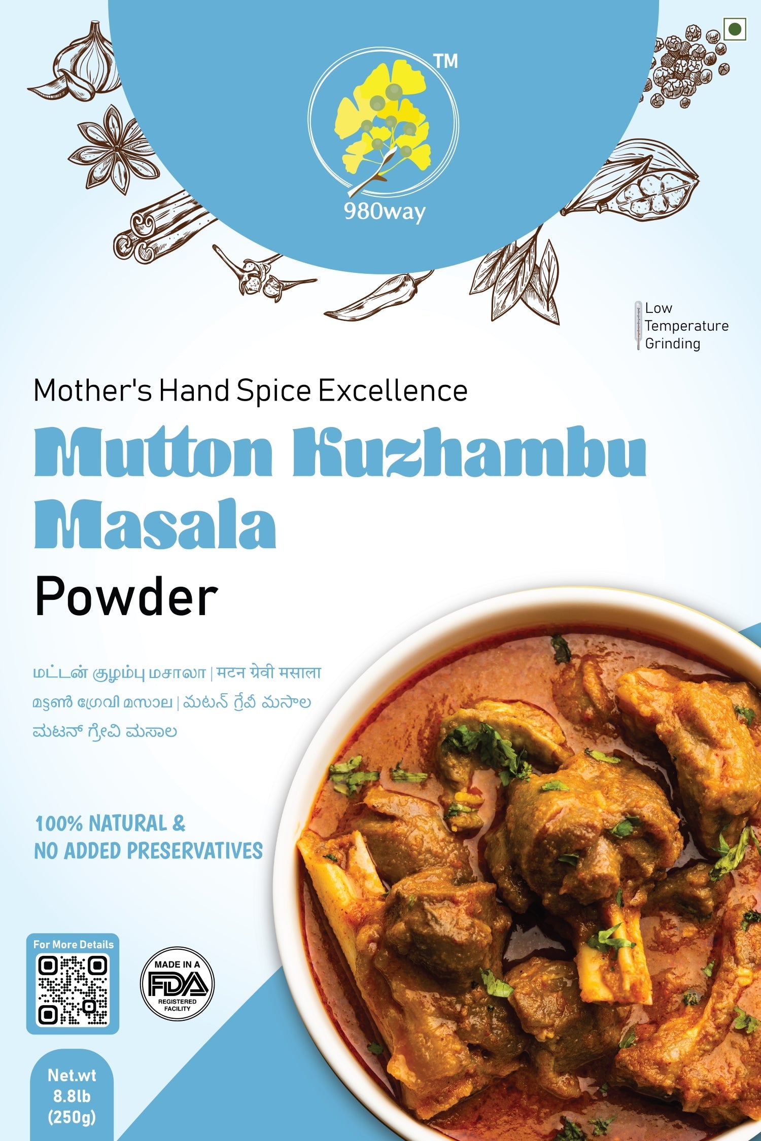 - Mutton Stew/Kuzhambu: Use the masala powder to season and flavor mutton stew or kuzhambu. Simply marinate the mutton with the spice blend along with other ingredients like yogurt, ginger-garlic paste, and cook it with onions, tomatoes, and spices until tender.