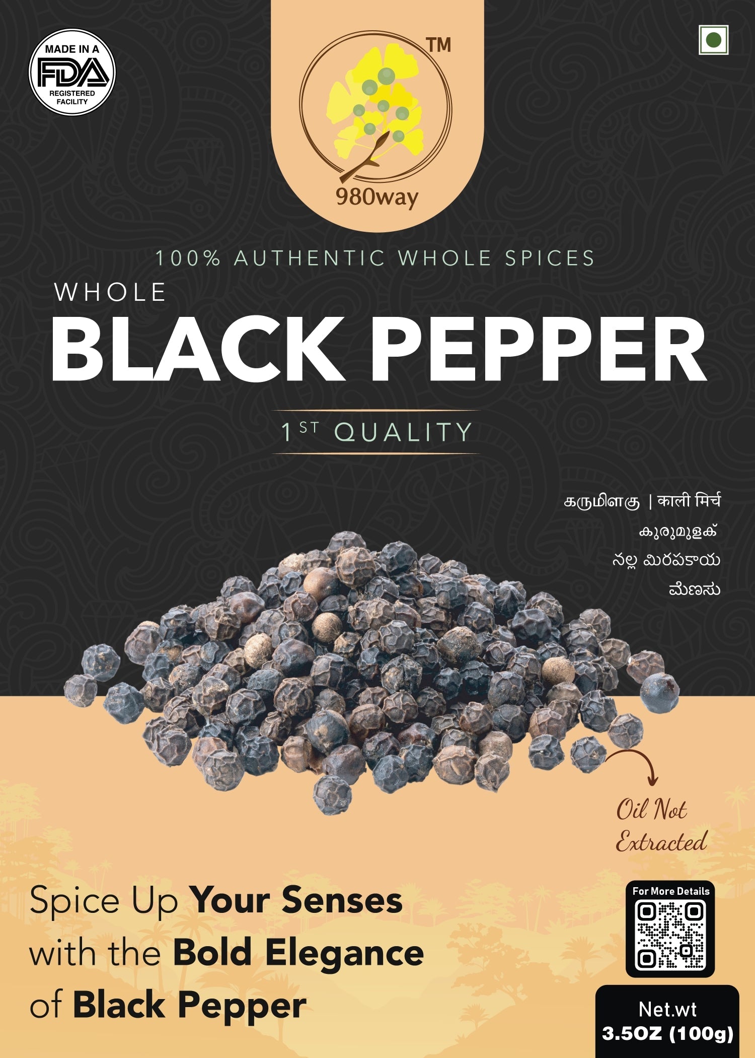 Whole Black Pepper - 100 gms (3.53 oz)